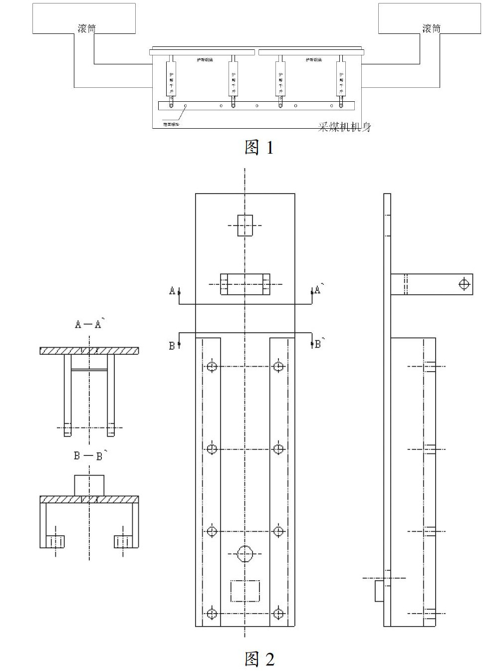 加工2組可調(diào)式護(hù)幫架,利用采煤機(jī)機(jī)身現(xiàn)有螺栓和銷軸,固定在采煤機(jī)機(jī)身上面(如圖1),護(hù)幫架由護(hù)幫千斤頂、導(dǎo)向槽、護(hù)幫梁組成(如圖2),護(hù)幫時(shí),利用采煤機(jī)的高壓水,控制護(hù)幫千斤頂活塞桿的伸縮,帶動(dòng)護(hù)幫梁擠壓煤壁,護(hù)幫梁與煤壁之間加設(shè)大、小柈,增加護(hù)幫面積,從而達(dá)到護(hù)幫的目的。采煤機(jī)作業(yè)時(shí),護(hù)幫架隨著采煤機(jī)移動(dòng),不需要人工搬運(yùn),實(shí)現(xiàn)了機(jī)載,護(hù)幫架對(duì)采煤機(jī)司機(jī)操作采煤機(jī)沒有影響,對(duì)采煤機(jī)正常運(yùn)行沒有影響。