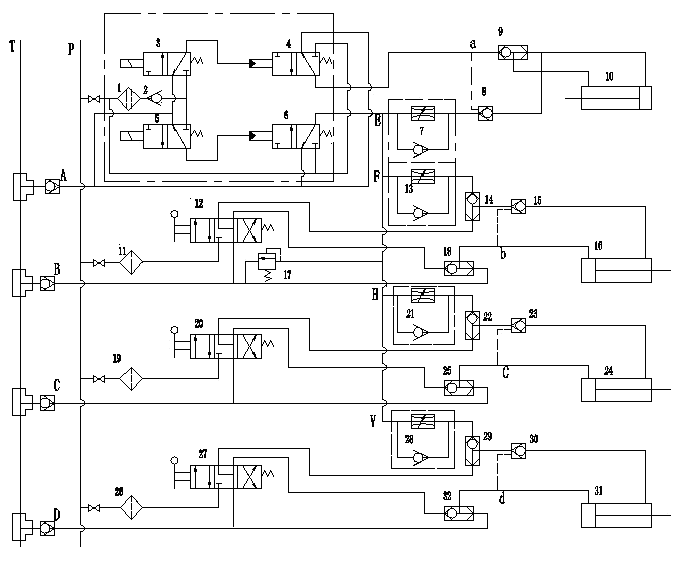 若端頭1#、2#、3#液壓支架三位四通閥換向閥(中位為y型機能)可不需要交替閥18,交替閥25、交替閥32,分別液控單向閥15b、23c、30d→三位四通閥12、20、27,中位→回液斷路閥→回液管路。