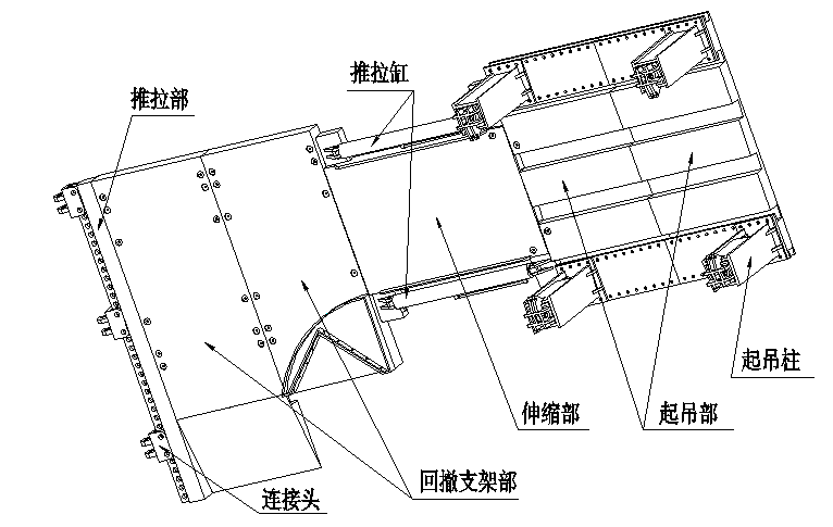 支架拆除平臺共分為三部分,分別為回撤支架部、伸縮部、起吊部,回撤支架部用于液壓支架的抽出及抹轉(zhuǎn),伸縮部用于連接、推移起吊部,起吊部用于支架的裝車,如圖3所示。