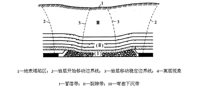大興礦綜采工作面推進(jìn)后,采空區(qū)上覆巖層發(fā)生位移,根據(jù)巖層的變形情況分成冒落帶、裂隙帶和彎曲下沉帶三帶。冒落帶在三帶的最底層,它是由于采煤工作面的移架或放頂失去支撐力后的直接頂垮落形成的,垮落的很有次序,自上而下進(jìn)行。一般冒落帶垮落的下部巖石塊度比較小排列也不規(guī)則,而上部巖石塊度大,排列比較整齊。通常冒落帶的高度是采高的 2 ~ 4 倍。三帶的中間是裂隙帶,裂隙帶受冒落帶的垮落壓實(shí)影響而彎曲下沉,并出現(xiàn)離層現(xiàn)象,有的地方發(fā)生斷裂。裂隙帶的范圍變化受冒落帶巖性和采高影響。在裂隙帶上方是彎曲下沉帶,彎曲下沉帶的范圍比較大,厚度也比冒落帶和裂隙帶大,基本不產(chǎn)生裂縫,有也是極微小的裂縫,其地表附近形成沉降區(qū),這個(gè)區(qū)域在采空區(qū)的上方,往往要比開采區(qū)域要大。這三帶越靠近采空區(qū)的巖帶對采煤工作面的影響越大,也就是冒落帶影響最大,其次裂隙帶,最后彎曲下沉帶。