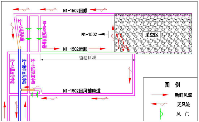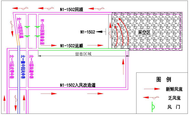 經(jīng)過外出對各地沿空留巷技術(shù)實地考察學(xué)習(xí)經(jīng)驗,并與集團(tuán)公司通風(fēng)處研究“Y”型和“W”型通風(fēng)方式的優(yōu)缺點,決定N1-1502工作面采用“兩進(jìn)一回”的“Y”型通風(fēng)方式,N1-1502運輸順槽和N1-1502入風(fēng)改造道進(jìn)風(fēng),N1-1502回風(fēng)順槽回風(fēng)。見圖4 曉南礦N1-1502工作面留巷初期通風(fēng)系統(tǒng)示意圖。