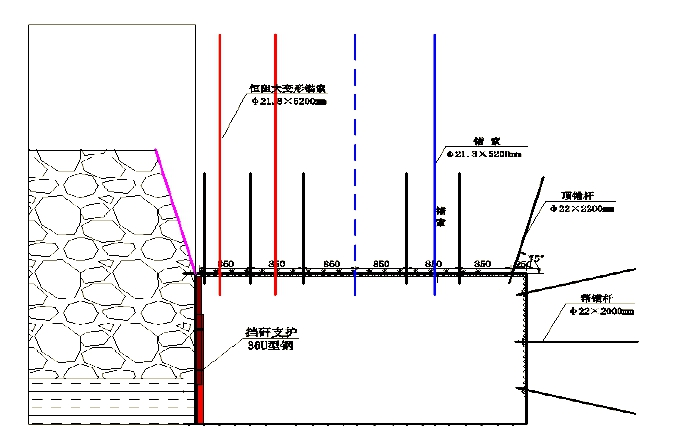 第一步:利用恒阻錨索對巷道頂板加強支護(hù),以保證隨后預(yù)裂頂板、切頂時不影響自動形成的巷道質(zhì)量;