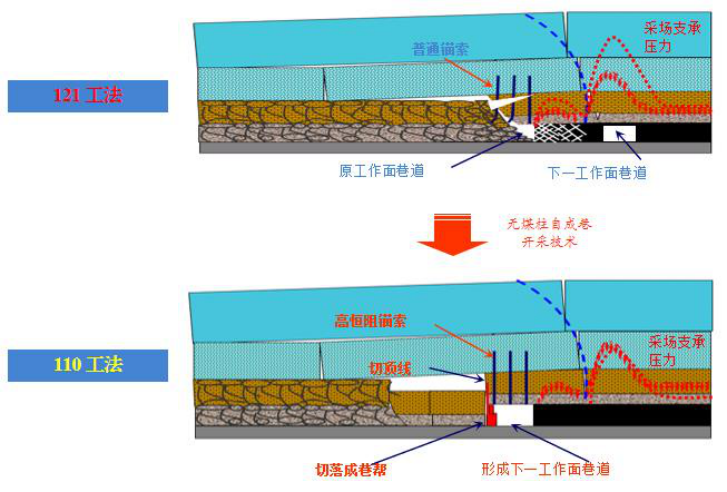 摘 ?要:很長一段時期內(nèi)我國工作面回采巷道主要采用留設(shè)區(qū)段煤柱,而傳統(tǒng)的留設(shè)區(qū)段煤柱開采方式無法進(jìn)行回收,衰老礦井經(jīng)過長時間開采所造成的資源浪費和采掘接續(xù)緊張的問題普遍存在。如何解決這一問題,成為我們當(dāng)下的難題,而“110工法”(“切頂卸壓-沿空留巷”無煤柱開采技術(shù))是解決這一難題的關(guān)鍵技術(shù),同時可以改變和優(yōu)化經(jīng)典的圍巖分布規(guī)律,大幅度減少圍壓力。