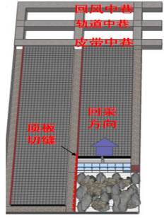 第三步: 工作面煤層回采后,在礦山壓力作用下, 將頂板切落下來形成巷幫 ,利用原巷道并經(jīng)加強支護(hù)形成新巷道, 同時借助巖石碎脹系數(shù)使巖石破碎后的體積增大為原來的1.3倍,壓實并隔斷采空區(qū),從而自動形成下一條回采巷道。