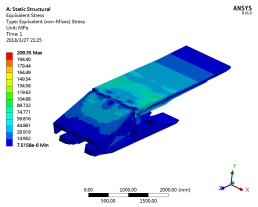 ??????? 工況1條件下的液壓支架頂梁應力云圖可見,頂梁的應力主要分布柱窩和中間筋板附近。柱窩附近的應力達到峰值,已達244.11MPa,并且由于偏置載荷的作用,左側柱窩的應力高于右側柱窩應力。頂梁中間筋板左側上部的應力比較大,已達156.21MPa,而在頂梁右側的柱窩附近應力達135.88MPa,左右柱窩處應力差為20.33MPa。液壓支架在實際使用過程中經常出現立柱頂斷銷軸后活塞桿頂進液壓支架頂梁的情況,此處分析與實際工況相符。頂梁柱窩處是頂梁在承受頂板載荷時的主要承力部位,此部位的強度直接影響液壓支架整機的使用壽命。除了柱窩附近有應力集中處外,頂梁其他部分的應力并不高,在許用應力范圍。