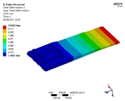 ??????? 工況2條件下柱窩附近的應力達到峰值,已達408.28MPa。頂梁中間筋板左側上部的應力達308.2MPa,頂梁右側的柱窩附近應力達264.52 MPa,左右柱窩處應力差為43.68 MPa。與工況1情況相比,工況2情況下左右柱窩處應力差增加了為20.35 MPa,主要是由于頂板載荷偏差增加所導致的。頂梁越靠近后端變形越小,越靠近頂梁前端變形量越大。