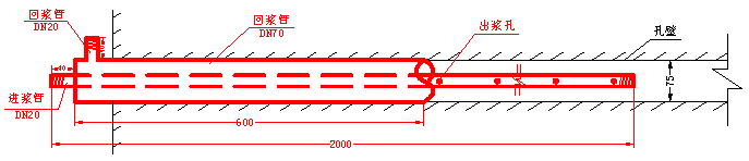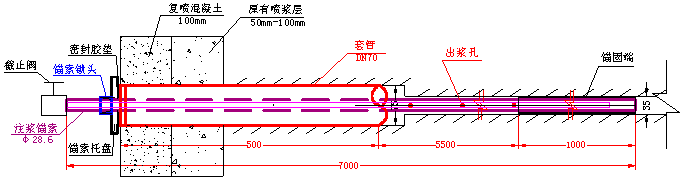 設(shè)計(jì)施工方案:噴漿(50~100mm厚)→鉆φ35mm鉆孔(7m深)→擴(kuò)孔至φ75mm(1m深)→安裝注漿錨索→安裝套管→復(fù)噴混凝土(100mm厚)→上膠墊、托盤及鎖具、進(jìn)行張拉(預(yù)緊力10t)→灌漿。在中空注漿錨索與注漿管路連接處接設(shè)截止閥,待注漿結(jié)束40分鐘后拆下截止閥,清水沖洗,重復(fù)使用。其他與自制鐵注頭注漿工藝相同。 ?