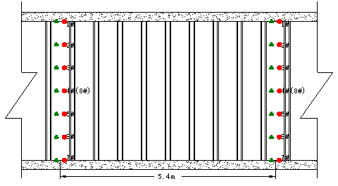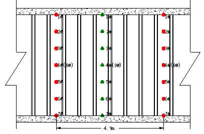 S2N5回順試驗(yàn)段,劈裂灌漿孔與蓋板灌漿孔布置在同一棚空內(nèi),灌漿孔排距5.4m,每排布置16個(gè)(8個(gè)蓋板灌漿孔、8個(gè)劈裂灌漿孔),見圖4。弊端是:灌漿孔過于集中,造成局部漿液灌不進(jìn)去;排距遠(yuǎn),漿液很難擴(kuò)散至兩排灌漿孔之間、灌漿效果差。