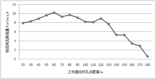 初期抽采階段為工作面推進且過鉆孔終孔點20m時,高位水平長鉆孔瓦斯流量明顯增大,其中5#孔純量達2.62m3/min。工作面繼續(xù)推進100m范圍內(nèi)為抽采穩(wěn)定階段。當工作面過終孔點距離120m以后,鉆場開始進入抽采衰減階段,此時下一個接續(xù)鉆場正好處于鉆孔初期抽采階段,保證工作面持續(xù)抽采。