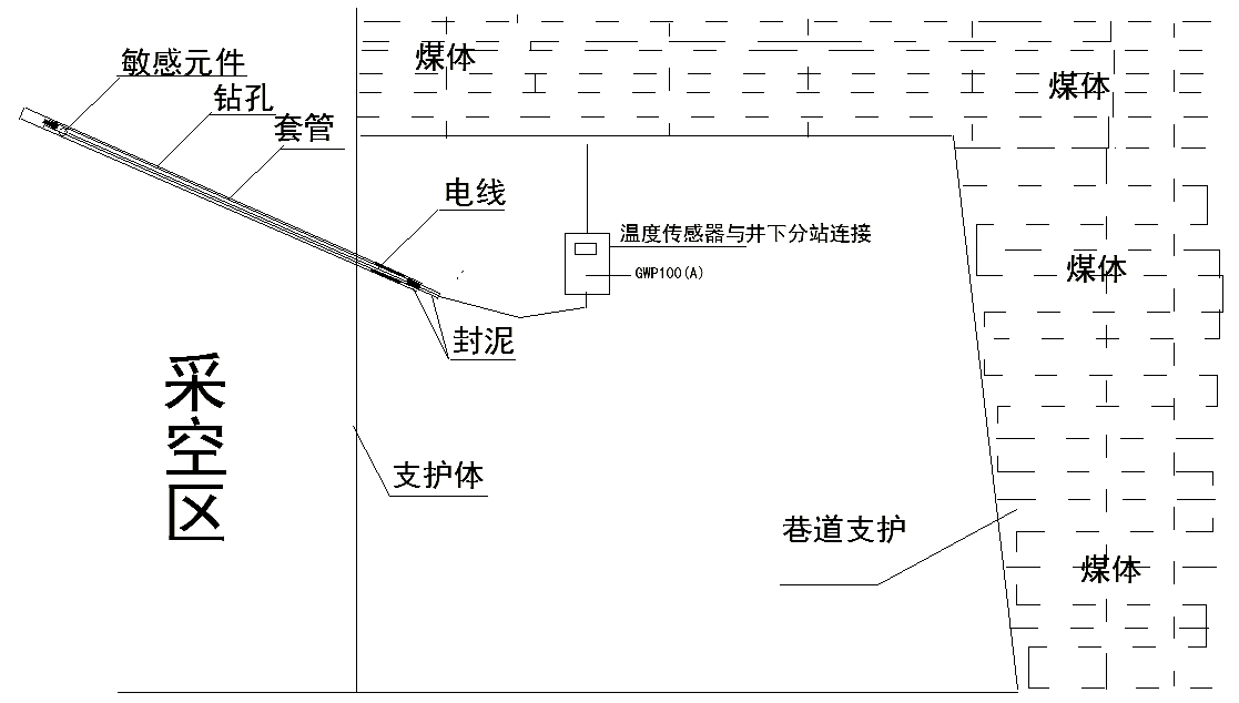 4.1.2利用溫度傳感器,對沿空留巷沿途每間隔100m進行重點區(qū)域進行檢測,確保數(shù)據(jù)準確及可靠。采空區(qū)檢測點距支護巷道表面1.5-3.0m的區(qū)間。為監(jiān)測5-7m區(qū)間采空區(qū)溫度的變化(如有需要可加長檢測元件電纜的長度),將GWP100(A)型溫度傳感器的檢測元件加長連接線(采用4×1.5mm2礦用阻燃電纜)達10m,在使用前對傳感器檢測數(shù)據(jù)失真狀況進行調(diào)試,對自然發(fā)火重點部位打孔徑為Φ15mm、深度達到采空區(qū)5-7m,埋入傳感器檢測元件,將傳感器聯(lián)入礦井安全監(jiān)控系統(tǒng),從而實現(xiàn)對煤層深部自然發(fā)火溫度的自動、連續(xù)監(jiān)測,配合火情監(jiān)測系統(tǒng)測溫裝置,更好地實現(xiàn)預報自然發(fā)火的作用。