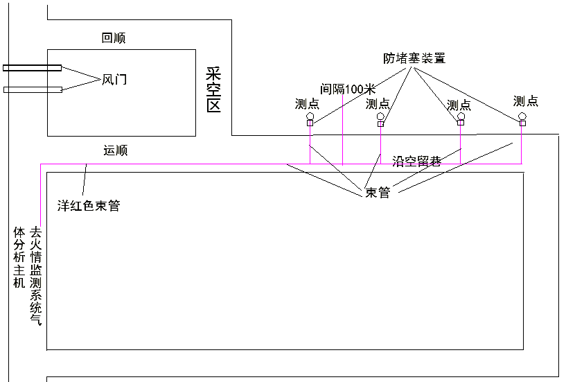 4.1.4利用火情監(jiān)測系統(tǒng)氣體分析主機對沿空留巷采空區(qū)的氣體進行分析化驗后將數(shù)據(jù)傳輸?shù)降孛婊鹎楸O(jiān)測系統(tǒng)中心站,并對數(shù)據(jù)進行分析處理被告超限報警。在回風留巷打孔,將束管穿過支護,進入采空區(qū)3到5m(如有需要可以根據(jù)實際情況加長束管的伸入長度),為防止束管口堵塞,管中要安設(shè)防堵塞裝置,當CH4、CO、C2H2、O2?和CO2這幾種氣體中,CO、C2H2出現(xiàn)時,說明采空區(qū)已有自燃發(fā)火現(xiàn)象。安裝方法見圖6所示。