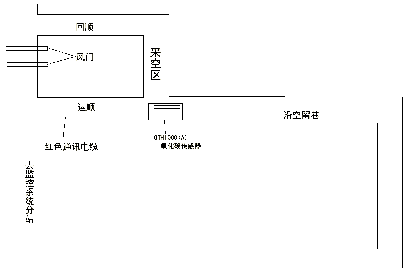 ? ? 4.1.5因為自然發(fā)火是一個較慢長的變化,所以在沿空留巷的末端也就是N1-1502工作面運順端頭,安設(shè)一臺一氧化碳傳感器,來檢測通過沿空留巷風流的一氧化碳濃度,以此來判斷沿空留采空區(qū)是否有自然現(xiàn)象及采空區(qū)是否有風漏入沿空留巷,從而來分析采空區(qū)的自然發(fā)火情況,當一氧化碳含量達到100ppm時,說明自燃發(fā)火存在自燃發(fā)炎現(xiàn)象。一氧化碳傳感器的安設(shè)數(shù)量可以根據(jù)實際情況具體安設(shè),增加密度,CO傳感器的安設(shè)位置如圖7所示: