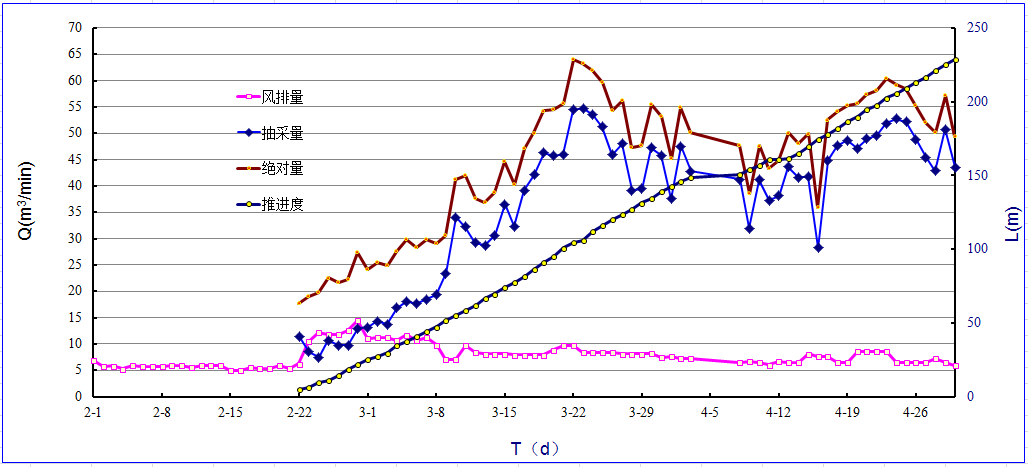 根據(jù)33#、32#、29#鉆場鉆孔參數(shù)設(shè)計,其合理層位應(yīng)控制在頂板垂高15~30m范圍、工作面控制范圍不應(yīng)超過傾向長度的1/3。通過鉆場斜交鉆孔抽采數(shù)據(jù)分析,隨著老頂初次來壓,斜交鉆孔抽采量逐漸增大;隨著工作面的逐步推進,頂板活動的周期來壓,瓦斯抽采量呈起伏變化??煞治龅贸?/span>1203工作面老頂初次來壓步距為47m,周期來壓步距為19m。經(jīng)統(tǒng)計,斜交鉆孔抽采量占絕對量的37.0%,占總抽采量的43.6%。