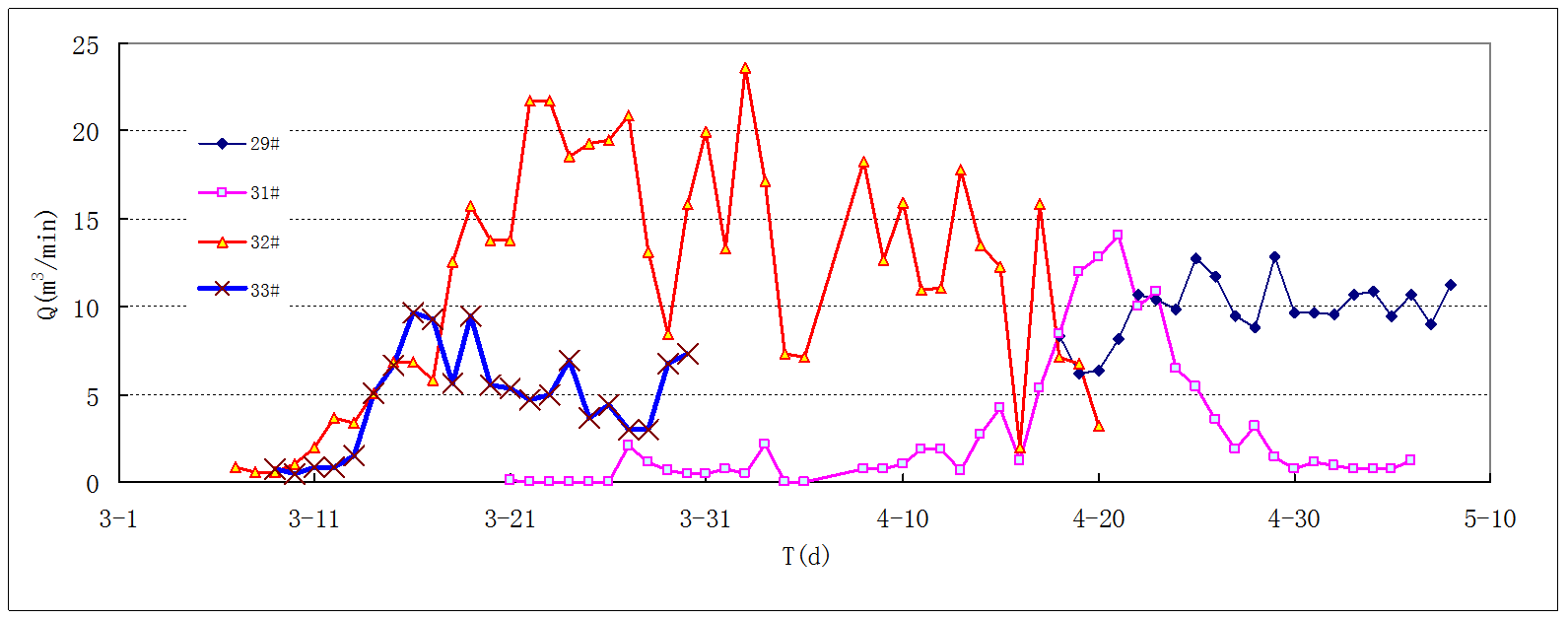 北二1203工作面在整個開采過程中,共對31個鉆場計施工斜交鉆孔進行了抽采,鉆孔工程量為30527m,抽采瓦斯純量392萬m3。自2月22日回采以來至8月末,回順35#~20#鉆場陸續(xù)對采空區(qū)及鄰近層瓦斯進行了抽采。從鉆場斜交鉆孔抽采數(shù)據(jù)統(tǒng)計來看,也存在著鉆場有效抽采鉆孔影響段較短、抽采效果一般、抽采時間及鉆孔參數(shù)需優(yōu)化等問題。為了分析各鉆場抽采接續(xù)的相互影響,作出33#、32#、31# 、29#鉆場斜交鉆孔抽采量隨推進時間變化曲線如圖3所示。