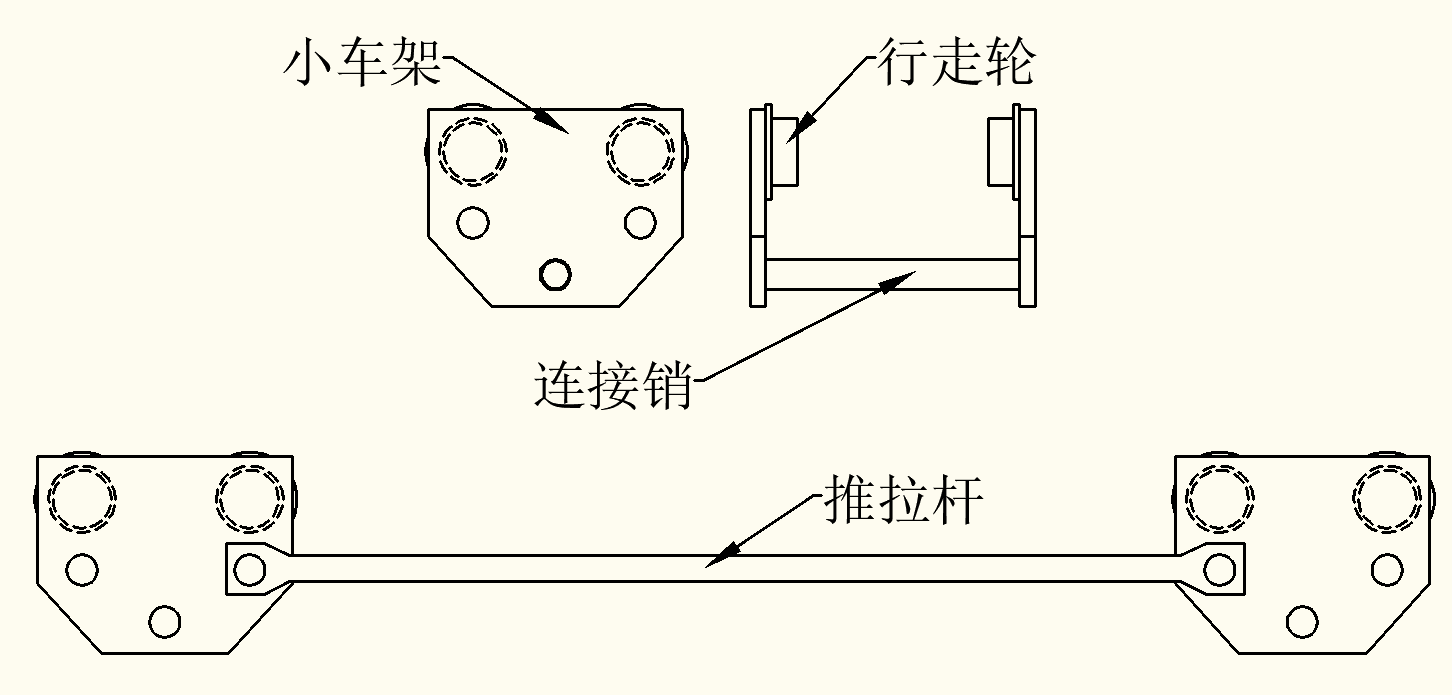 行走小車主要的作用是通過(guò)夾持在軌道上的行走輪,使吊掛電纜可以在軌道上滑行,前進(jìn)或后退。行走小車每1m置一個(gè),小車間的推拉桿長(zhǎng)度1m,用1寸鍍鋅管制成,其作用是當(dāng)行走小車由高到低安裝時(shí),擋住行走小車向前下滑,當(dāng)行走小車由低到高安裝時(shí)同樣能保證行走小車向后下滑。每件行走小車可起吊重量1t,滿足起吊需要。行走小車示意圖如圖4所示。