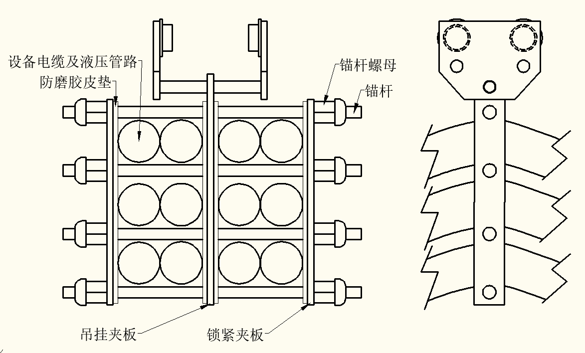電纜夾具如圖5所示。電纜夾具可以將電纜整齊的固定在單軌吊上。電纜夾具由12mm厚鐵板加工而成,分為吊掛夾板及兩側(cè)的鎖緊夾板,吊掛夾板的作用是與行走小車連接將電纜夾具與小車連接成一體。鎖緊夾板的作用是通過(guò)擰緊兩端錨桿螺帽,將內(nèi)部電纜夾緊固定,防止電纜發(fā)生竄動(dòng)。電纜夾具的間隔錨桿為Φ22×400mm,間隔錨桿的長(zhǎng)度可以根據(jù)所夾持電纜數(shù)量的多少增加或縮短。使用時(shí)錨桿外側(cè)套橡膠管,夾板內(nèi)側(cè)墊皮帶防止錨桿及金屬夾板直接與電纜外皮接觸導(dǎo)致磨損。鋪設(shè)時(shí)將電纜鋪設(shè)在上層,液壓管路鋪設(shè)在下層,一是防止液壓管路泄露后導(dǎo)致電纜淋水,二是便于檢修液壓管路竄液等故障。