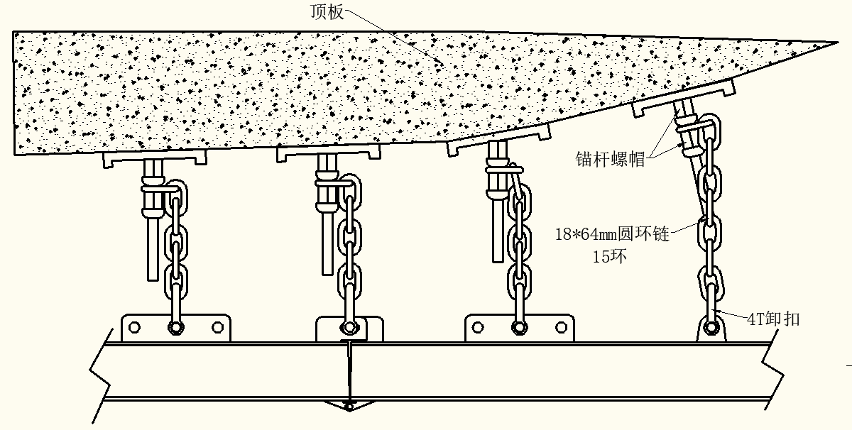 吊掛裝置如圖6所示。吊掛裝置由15環(huán)18*64mm圓環(huán)鏈及4T卸扣組成。4T卸扣方便與單軌吊軌道快速連接,圓環(huán)鏈與工作面頂板專用起吊錨桿連接,用錨桿螺帽鎖緊。當(dāng)工作面頂板高低不平時(shí),可以通過(guò)調(diào)整圓環(huán)鏈長(zhǎng)短保證軌道平直,使單軌吊順利通過(guò)。