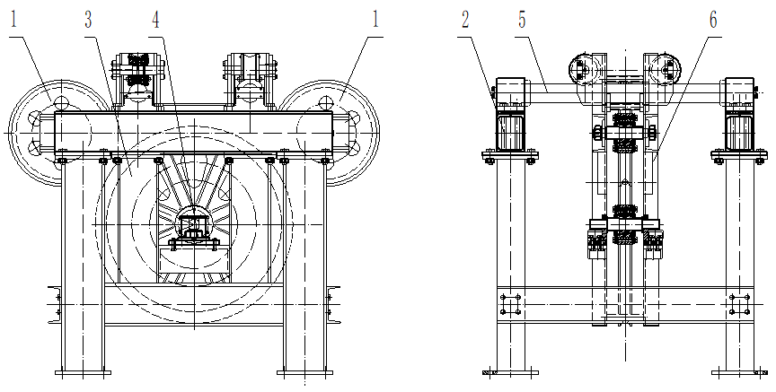 1——壓繩輪;2——機架;3——測力輪;4——稱重傳感器;5——橫梁;6——測力輪軸組件