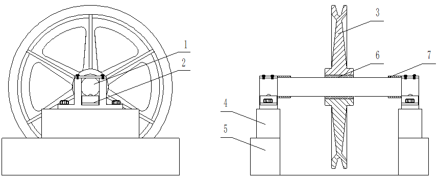 1——天輪軸;2——稱重傳感器;3——天輪;4——枕座;5——混凝土基礎;6——黃銅套;7——定位套