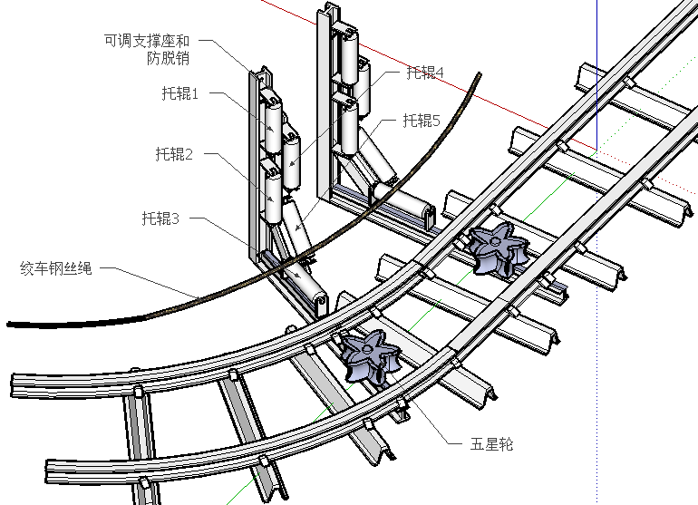 (4)導向性能好。道心中間安裝五星輪,控制鋼絲繩在軌道中心運動,解決巷道曲率半徑小,鋼絲繩橫向擺幅大,容易兜幫造成車輛掉道現(xiàn)象,當車輛運行至五星輪前,鋼絲繩緩緩彈起,最終承載在幫立輪上。