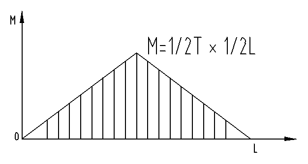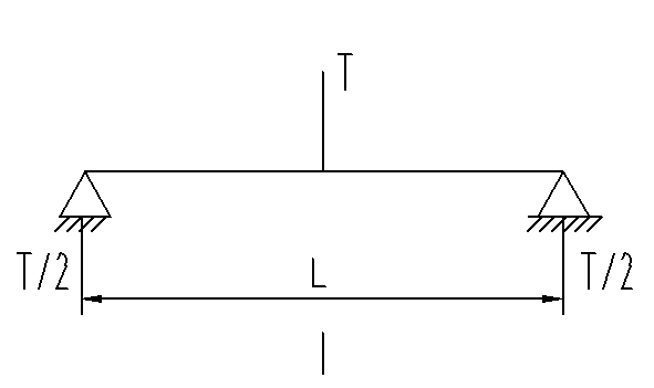 第二步,計算托輥承受彎矩,如圖3所示,托輥可以簡化為簡支梁,兩側(cè)支承力相等,且總和等于T,托輥承受的彎矩M=1/2T×1/2L