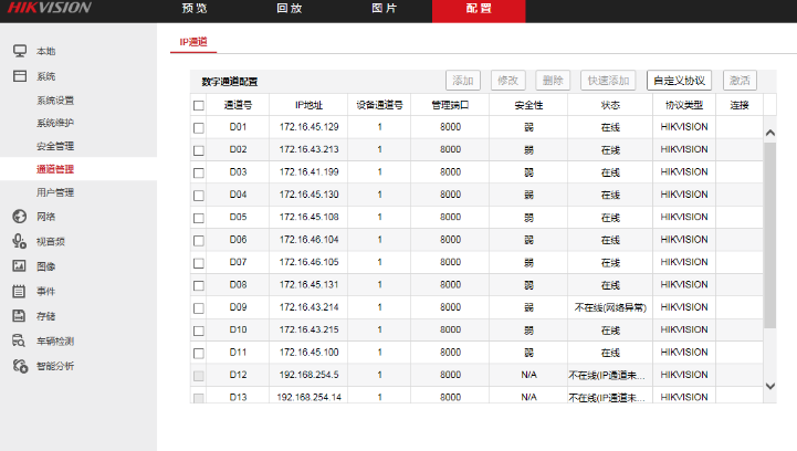 開機(jī)后手動設(shè)置IP,不要自動,IP需要設(shè)置在本局域網(wǎng)同一網(wǎng)段內(nèi)。例如對地面工作場所網(wǎng)絡(luò)錄像機(jī),地址設(shè)為172.16.41.198,然后登錄像機(jī)配置界機(jī),進(jìn)行存儲管理,格式化硬盤,存儲計劃配置,錄像計劃配置。登陸錄像機(jī)配置界面,視音頻 ,按通道設(shè)置攝像頭碼率、分辨率,然后進(jìn)入通道管理,添加已安裝的網(wǎng)絡(luò)攝像頭。