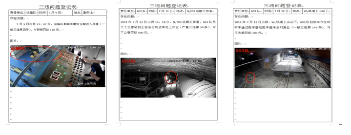 在日常工作中,井口視頻監(jiān)視室堅持守在監(jiān)控終端,實(shí)時監(jiān)管視頻監(jiān)視區(qū)域的安全生產(chǎn);通過視頻監(jiān)控回放功能,對違規(guī)違章行為進(jìn)行寫實(shí)和處理。同時,每天安排人員對井下各地點(diǎn)視頻存儲卡進(jìn)行回放查看,事后瀏覽追溯“三違”行為,讓以往一些很難抓住現(xiàn)形的違章行為真相大白,下達(dá)“三違”通知單除了描述“三違”行為及處理意見外,附錄“三違”截圖同時附在其內(nèi),使得“三違”人員心服口服。