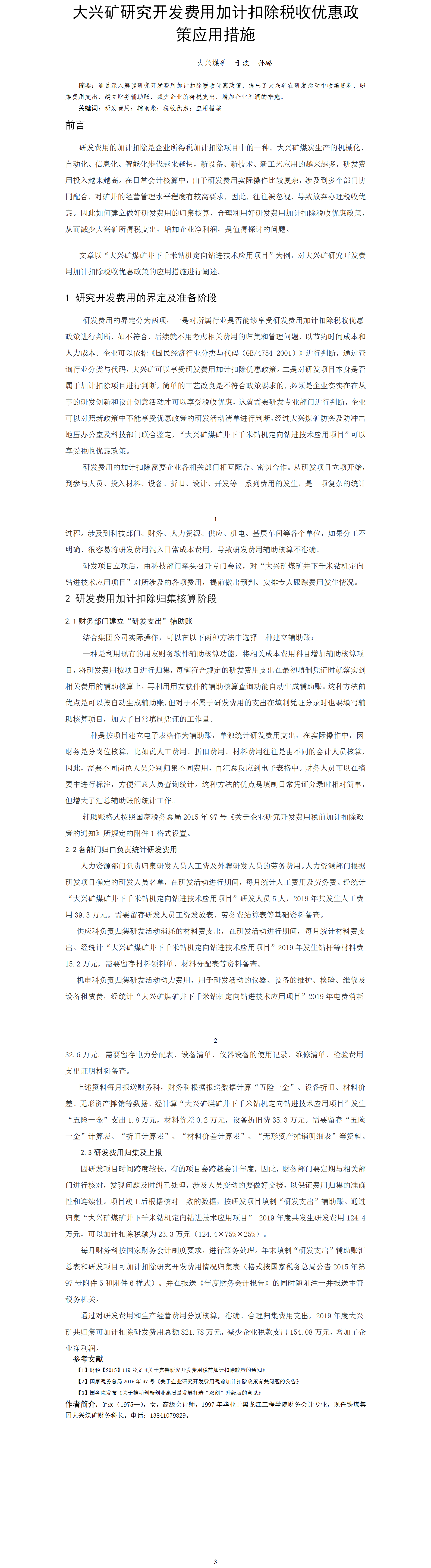 第48屆等級獎?wù)撐?--大興礦研究開發(fā)費用加計扣除稅收優(yōu)惠政策應(yīng)用措施