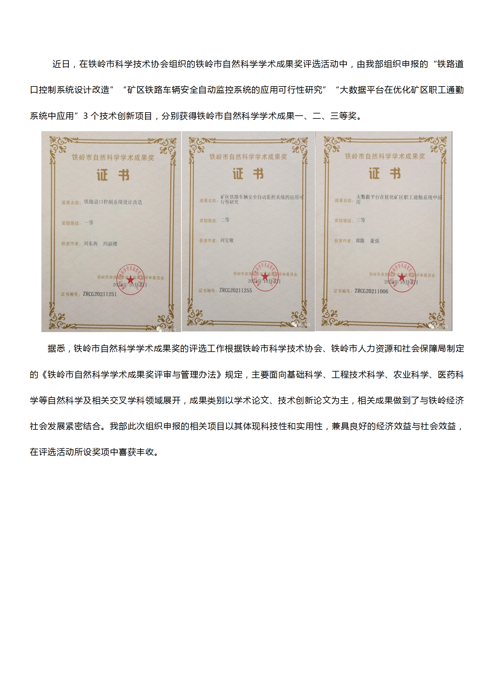 運(yùn)輸部三個(gè)科技項(xiàng)目獲得鐵嶺市自然科學(xué)學(xué)術(shù)成果獎(jiǎng)