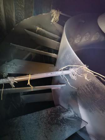當煤質(zhì)變化時,應(yīng)通過實驗來確定煤粉的經(jīng)濟細度,通常最佳細度控制在R90=20~25%。通過檢測,發(fā)現(xiàn)5號制粉系統(tǒng)煤粉均勻度差。打開人孔檢查發(fā)現(xiàn)粗粉分離器的折向擋板開度與實際指示不一致,開度不均勻。檢修人員調(diào)整后,擋板位置與實際相符,開度均勻。再次檢測,煤粉顆粒均勻度恢復正常。圖2、圖3分別為調(diào)整前、后5號粗粉分離器折向擋板位置對比。因此,運行中要定期檢測煤粉細度和均勻性,有問題及時調(diào)整。