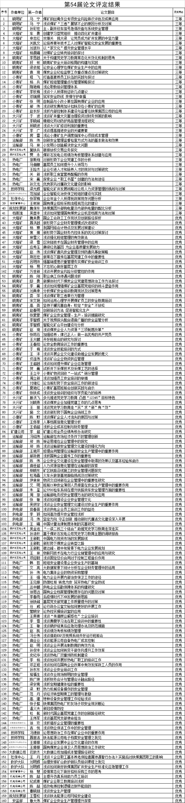 ? ? “鐵法能源公司第五十四屆科技論文交流會”共征集人力資源、財務管理、企業(yè)管理、安全培訓、政工論文196篇。經公司組織評審,確定優(yōu)秀科技論文162篇,其中:三等獎41篇、優(yōu)秀獎121篇。對獲獎論文作者頒發(fā)榮譽證書,以資鼓勵。