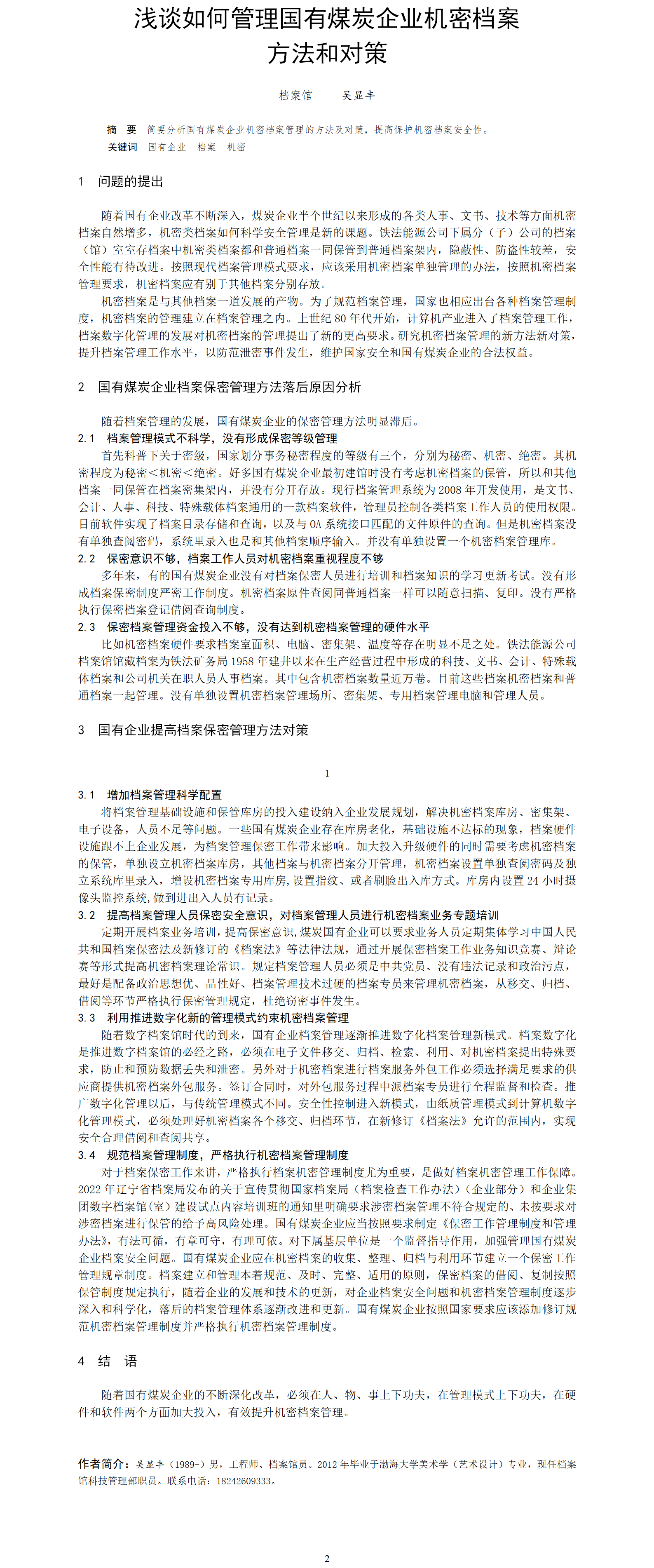 第54屆等級(jí)獎(jiǎng)?wù)撐?--淺談如何管理國(guó)有煤炭企業(yè)機(jī)密檔案方法和對(duì)策