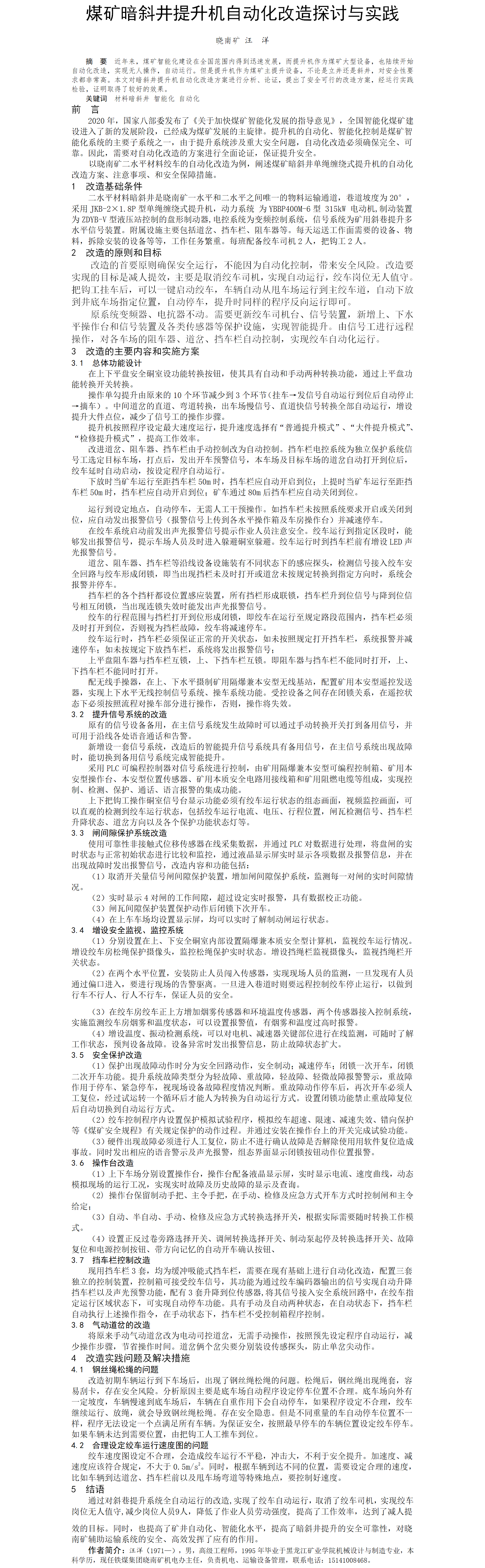 第56屆等級(jí)獎(jiǎng)?wù)撐?--煤礦暗斜井提升機(jī)自動(dòng)化改造探討與實(shí)踐