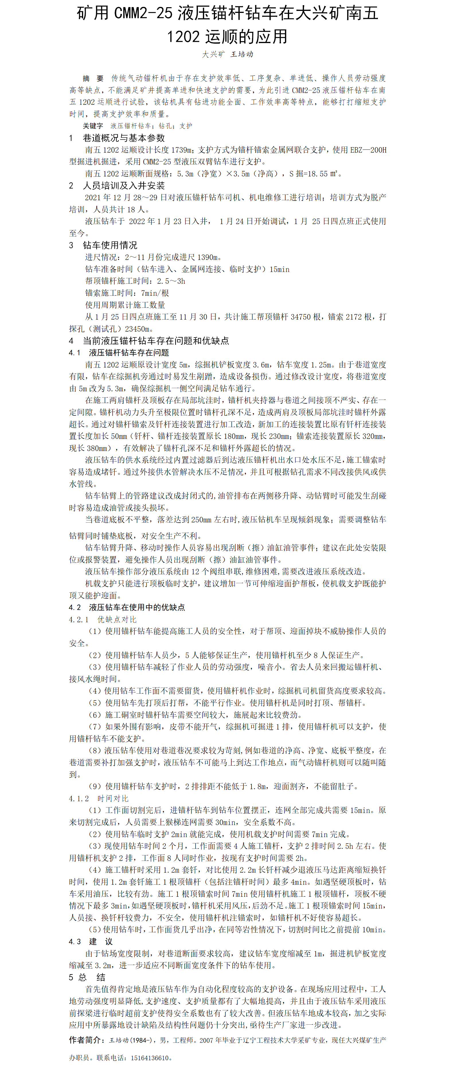 第57屆等級(jí)獎(jiǎng)?wù)撐?--礦用CMM2-25液壓錨桿鉆車在大興礦南五1202運(yùn)順的應(yīng)用
