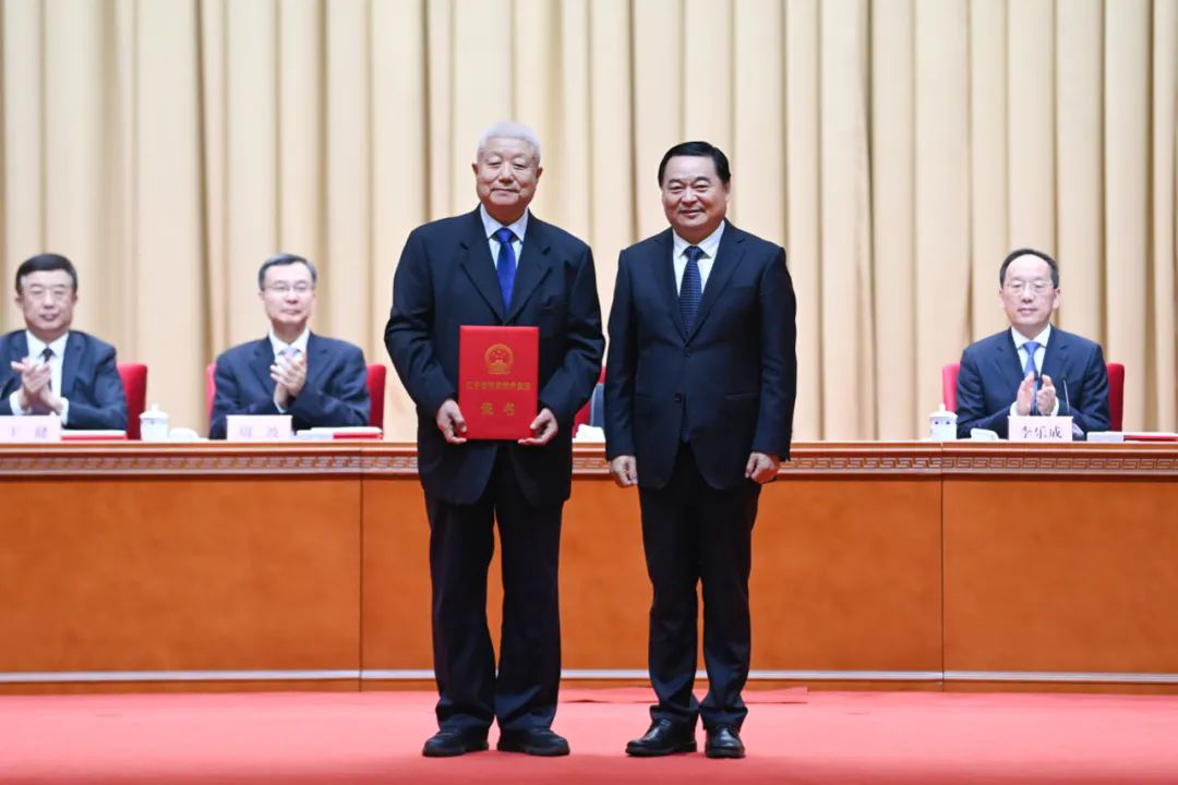 省委書記、省人大常委會主任郝鵬為省科學技術(shù)獎最高獎獲得者沈陽航空航天大學楊鳳田院士頒獎。