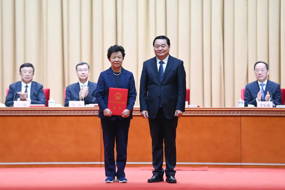 省委書記、省人大常委會主任郝鵬為省科學技術(shù)獎最高獎獲得者大連工業(yè)大學朱蓓薇院士頒獎。