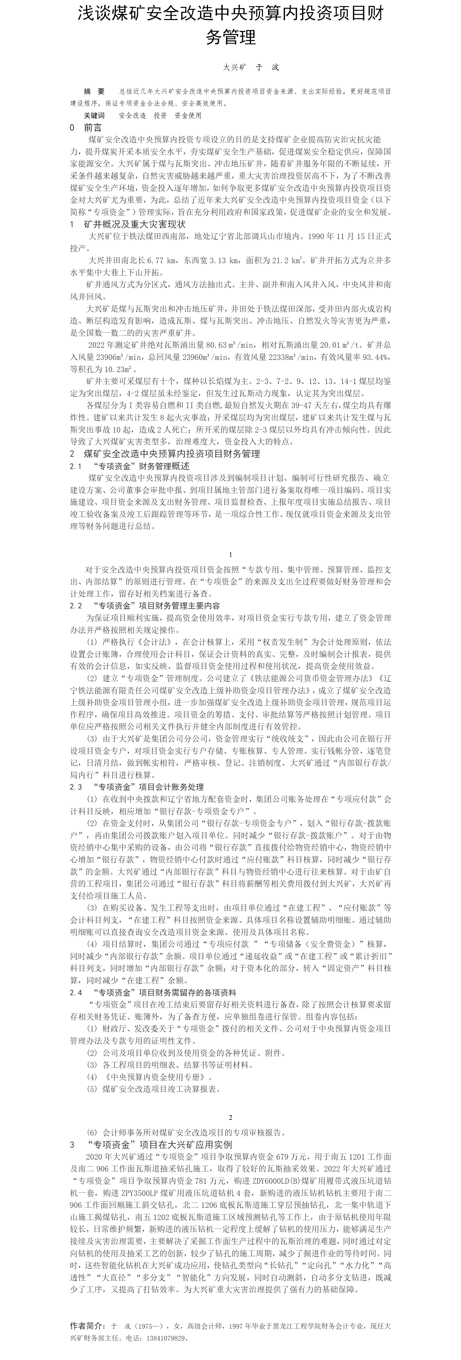 第58屆等級(jí)獎(jiǎng)?wù)撐?--淺談煤礦安全改造中央預(yù)算內(nèi)投資項(xiàng)目財(cái)務(wù)管理