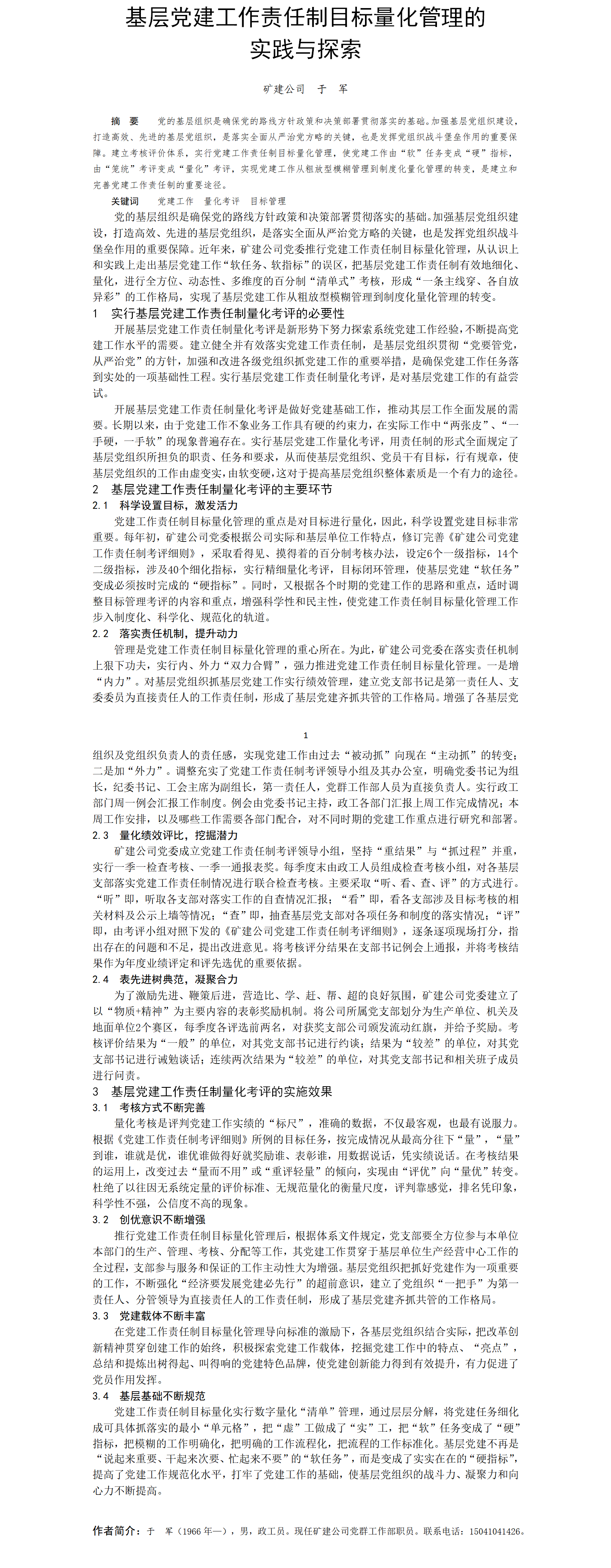 第58屆等級獎?wù)撐?--基層黨建工作責(zé)任制目標(biāo)量化管理的實踐與探索