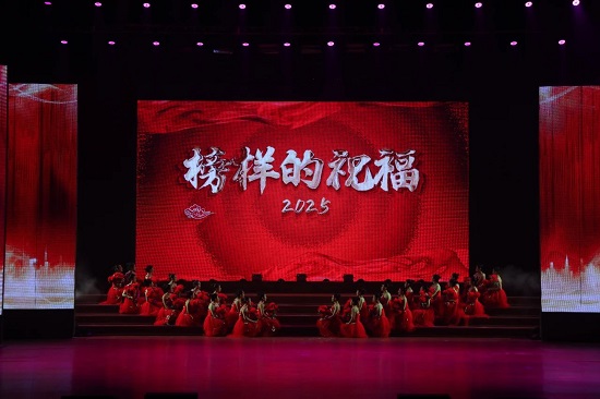 當晚6時30分,在開場歌舞《和美鐵能》熱烈的氣氛中,演出正式拉開序幕,演員們身著鮮艷奪目、寓意著好日子紅紅火火、蒸蒸日上的紅色節(jié)日盛裝,手拿春聯(lián)、福字、紅燈籠、鞭炮和冰糖葫蘆涌上舞臺中央,在激昂的鼓點和歡騰的樂曲聲中載歌載舞,營造出喜慶的節(jié)日氛圍和一片歡樂的紅色海洋,瞬間將“年味兒”和幸福感“拉滿”。