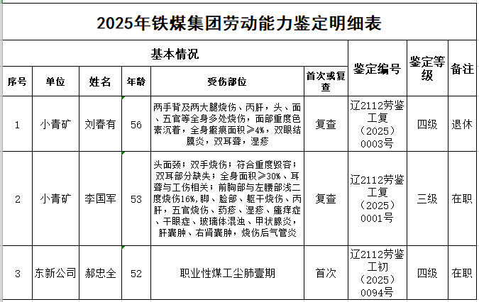 經(jīng)鐵嶺市人力資源和社會(huì)保障局勞動(dòng)能力鑒定委員會(huì)于2025年3月9日進(jìn)行工傷職工勞動(dòng)能力鑒定,現(xiàn)將鑒定結(jié)論予以發(fā)布公示。鑒定為1-4級人員3人。其中:在職2人,退休1人?,F(xiàn)將有關(guān)信息公示如下,請廣大員工及家屬認(rèn)真監(jiān)督,如發(fā)現(xiàn)傷情與實(shí)際不符的,請于2025年4月20日前向鐵嶺市人力資源和社會(huì)保障局勞動(dòng)能力鑒定委員會(huì)、鐵煤集團(tuán)公司社會(huì)保險(xiǎn)管理中心予以舉報(bào)。公示期:2025年4月14日至4月20日。