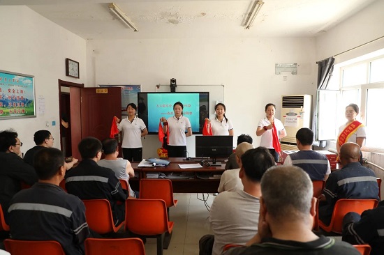 ▲曉南礦巾幗志愿者來到職工班前會,表演手勢舞和安全教育快板,提醒大家時刻保持警惕,杜絕不安全行為。