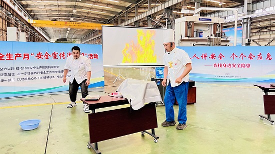 ▲通用重機公司模擬食堂煤氣泄漏、灶臺失火場景,向職工演示正確自救處置方法。