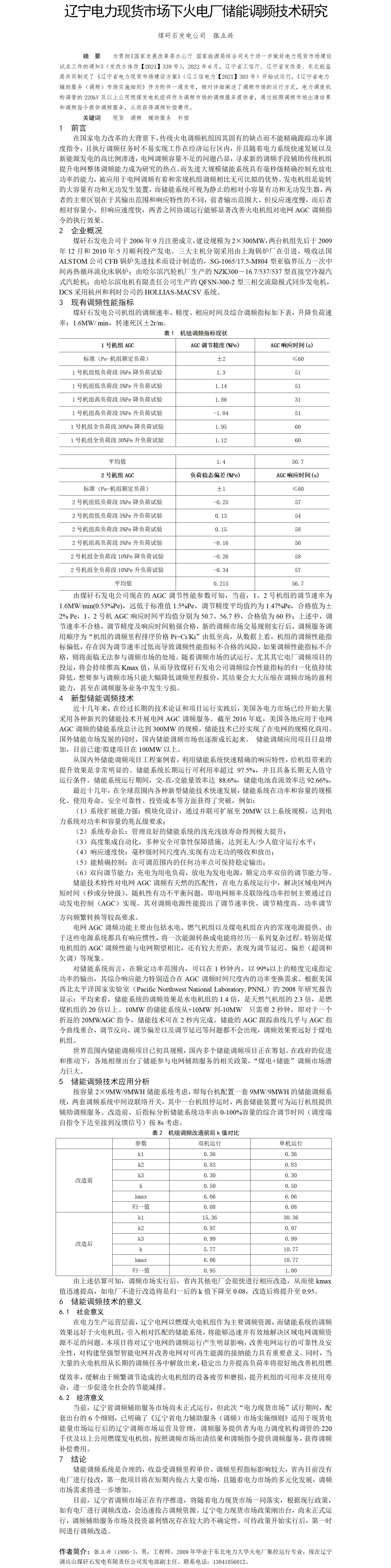 第60屆等級(jí)獎(jiǎng)?wù)撐?--遼寧電力現(xiàn)貨市場(chǎng)下火電廠儲(chǔ)能調(diào)頻技術(shù)研究