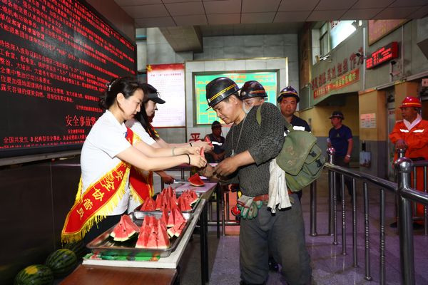 該礦還在井口搭建場(chǎng)地,為升入井職工送上現(xiàn)切的大西瓜,沖泡冰涼爽口的酸梅湯,讓大家在炎炎夏日里實(shí)實(shí)在在感受到冰爽與清涼。